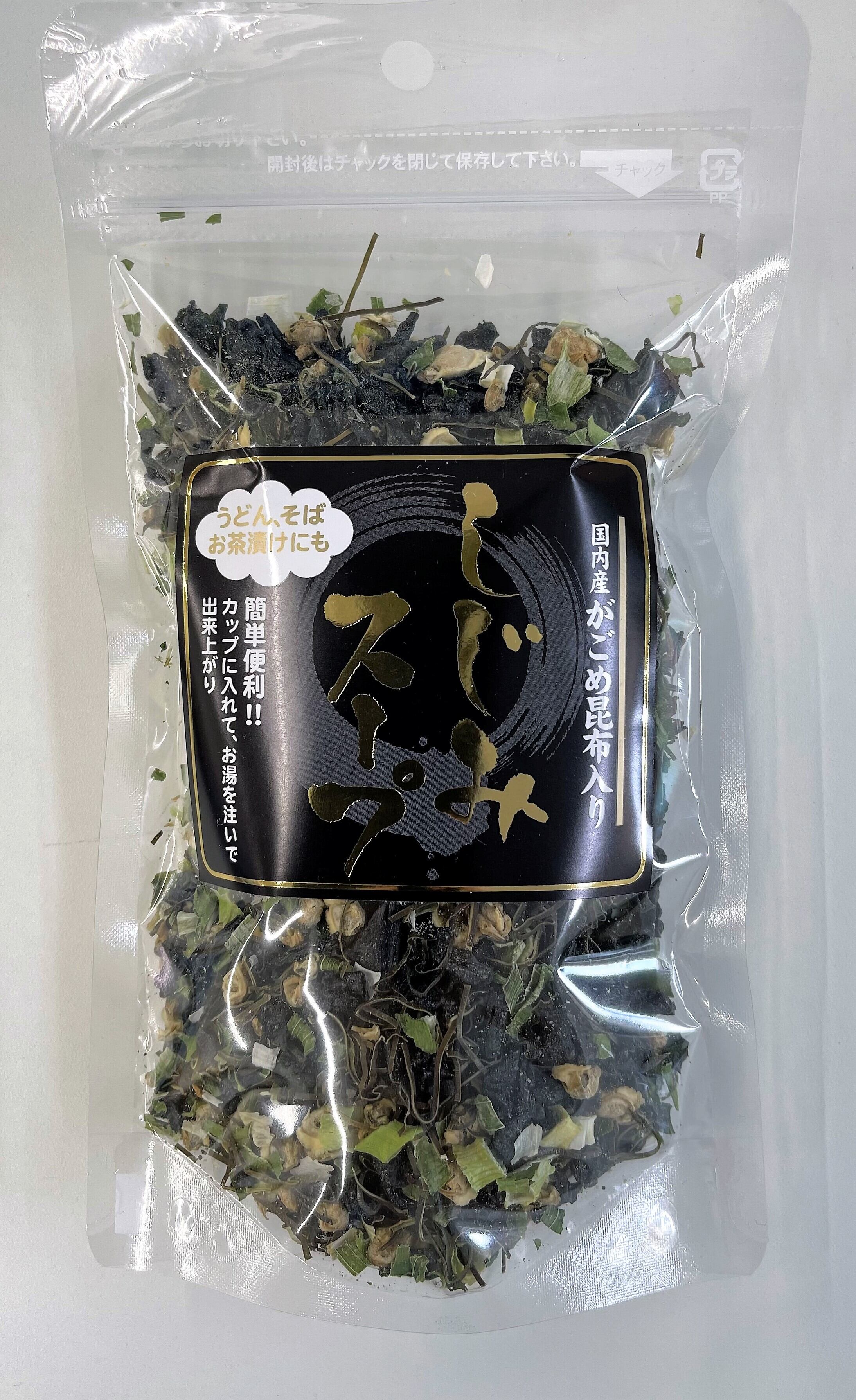 原材料:わかめ乾燥スープ(コンソメ)(乾燥わかめ(中国産)、食塩、乳糖、コンソメ、砂糖、風味調味料)(小麦・乳成分・大豆・鶏肉を含む)(国内製造)、乾燥しじみ(しじみ、食塩)、こんぶ、乾燥ネギ、めかぶ、がごめ昆布/調味料(アミノ酸等)、着色料(カラメル)、酸化防止剤(V.E)
